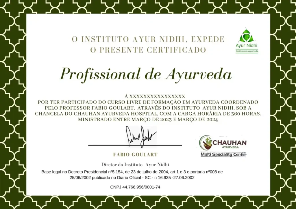 O Instituto Ayur Nidhi apresenta o curso de formação profissional em Medicina Tradicional Ayurveda, seguindo as orientações do Ministério de Ayush da Índia para cursos internacionais. Nosso certificado está baseado nas diretrizes do MEC para cursos da área de Educação Profissional (cursos livres) e é acreditado pelo renomado Chauhan Ayurveda Hospital, garantindo reconhecimento e excelência.